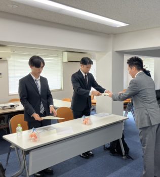 内定式では、社長から内定者の二人にお祝いの言葉が贈られ、さらに会社の目標や経営理念についてのお話しもありました。